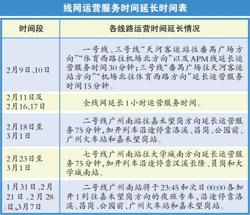 1月28日至2月11日,广州地铁将在广州南站、广州火车站、滘口、广州东站、机场南、机场北、天河客运站、南洲、花城路、庆盛、从化客运站11个重点枢纽车站为乘客提供“暖冬服务”,包括设置“暖冬驿站”、组建“暖冬服务”行动派,主动为乘客提供问询、药箱、行李打包、“爱心行李车”运送等便民服务。同时,在与客运枢纽相接的车站边门处设置“春运绿色通道”,引导乘客快速通行。此外,广州地铁将在公园前、北京路、体育西路、体育中心、体育中心南、滘口、番禺广场、中新、增城广场9个靠近花市的站点提供“花市文明剪”,帮助乘客修剪超长花枝以便进站乘车。