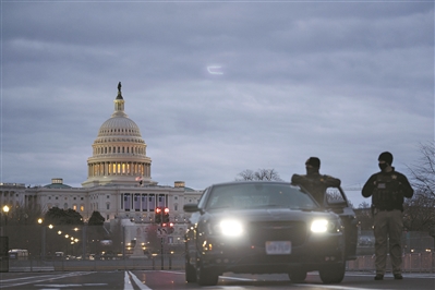 白宫和国会大厦戒备森严,国家广场周围路段几乎全线车辆限行,全副武装的国民警卫队队员、安保人员和重型军用车辆层层把守,重点区域和重点建筑周围竖起围栏……法新社用伊拉克首都巴格达“绿区”来类比此刻的美国首都。