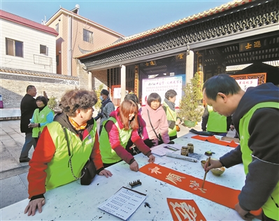 伦教文化志愿者在写春联。广州日报全媒体记者王名润 通讯员伦宣摄