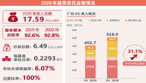 3月4日,越秀房托基金(以下简称“越秀房托”)发布2020年业绩公告,2020年年收入总额为17.59亿元,整体出租率约92.8%,同比增长0.2个百分点。记者在越秀房托2020年度业绩发布会上发现,这一年挑战与机遇并存。2020年,越秀房托物业组合估值约为人民币345亿元,整体期末出租率保持在92.8%高位。在越秀房托所持有物业组合中,写字楼资产占比超过50%,其中广州IFC发挥主力作用,全年收入9.31亿元,占基金收入53%。
