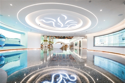 中行“5G智能+”湾区馆以“水”作为主要元素并贯穿整个场馆设计,通过一汪活水的注入寓意源源不断的财富升值。