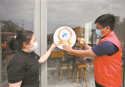 广州日报讯 (全媒体记者陈治家 通讯员崔媛媛摄影报道)“此商家员工疫苗接种率达100%,欢迎光临。”昨日,珠海市金湾区红旗镇双湖社区的工作人员手拿一张张颜色不同的圆形贴纸标识来到位于正光广场的星巴克商铺,在与该商铺店长交流后将金色的标识粘贴在了商铺大门最醒目的位置。这是由红旗镇政府统一设计制作的,通过创新工作方式对积极组织员工进行疫苗接种的商家主动承担社会责任进行鼓励,也能让消费者增强对商家环境安全的信任度,引导更多群众积极参与接种疫苗。