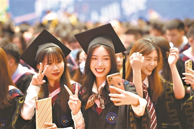 参加毕业典礼的2020届毕业生在现场拍照留念。
