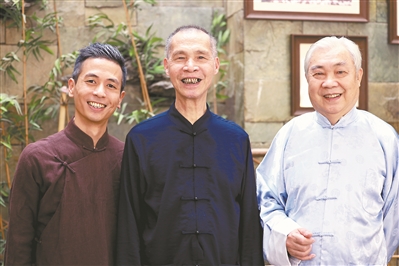 从左至右分别为徒弟彭嘉志、师叔姚焕然、师父颜志图