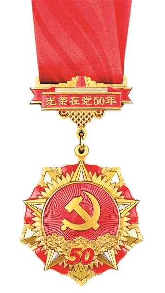 “光荣在党50年”纪念章通径为50毫米,材质为铜和锌合金,主色调为红色和金色。主章由党徽、五角星、旗帜、丰碑、向日葵、光荣花、光芒等元素构成,其中党徽象征党的领导核心地位和党员信念坚定、对党忠诚;丰碑寓意党的光辉历程和丰功伟绩;向日葵寓意全党全国各族人民紧密团结在党中央周围;光芒象征党的光辉照耀;五角星代表薪火相传;光荣花寓意繁荣盛世、国泰民安和褒奖荣耀;旗帜象征共产主义崇高理想与事业永续。副章由山河、中国结和红飘带等元素组成,飘带上雕有“光荣在党50年”字样,寓意党员不忘初心、牢记使命,勇攀高峰、永葆青春。