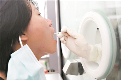 记者在医院研修楼外广场看到,一个类似大型集装箱的白色舱体置于广场,透过窗口可以看到全身防护的实验室工作人员正在内部忙碌,主体一侧的采样区设有两个带圆形窗口和测温设备的采样小舱,工作人员在舱内通过窗口进行采样。等待采样的市民在采样舱前排队等候。接受检测的市民只要几步上前,在小窗前张口即可完成采样。