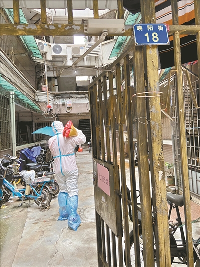 瑞宝街南洲名苑小区共有1500多户居民,其中一栋楼被列为中风险区,实行封闭管理,居民足不出户,所有物资由做好防护措施的工作人员送到家门口。其他11栋楼实行封控管理,每户派一名3天两次核酸检测阴性的居民到楼下取物品。
