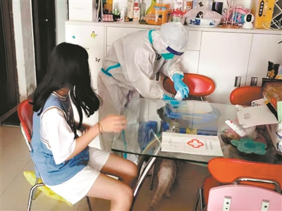 6月8日下午,广州市海珠区中医院门急诊护士长林雪妹接到任务,要准备好狂犬疫苗,穿好防护服,到区内正在封控管理的瑞宝街南洲名苑为一名孩子接种第四针狂犬疫苗。