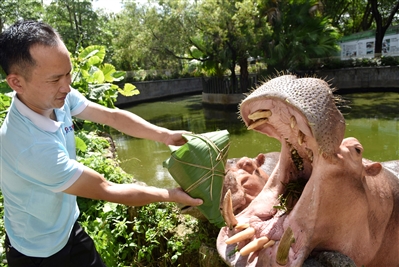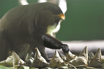 饲养员为不同的动物准备了不同口味的粽子,很受动物们的欢迎。