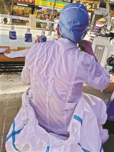5月21日中午,在荔湾区进行核酸检测的护士李佩真脱下防护服、全身被汗水浸透。(图片由采访对象提供) 图/广州日报全媒体记者骆昌威 摄(除署名外)