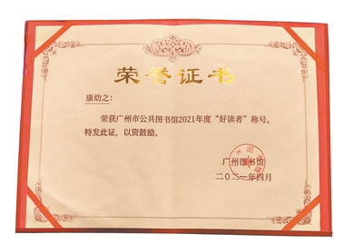 自2017年起,广州市公共图书馆每年评选出10名热爱阅读、热爱图书馆的市民,向他们颁发“好读者”证书。去年,获得了“2021年度广州市公共图书馆好读者”称号的康幼之,不由得感慨:“广州图书馆最贴心,最能留住人。”