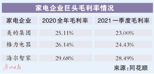 其中,美的集团一季度毛利率为23.00%,较之2020年25.11%的毛利率出现下滑。另一家电行业龙头格力电器一季度毛利率为24.43%,而2020年毛利率则为26.14%。此外,海尔智家一季度毛利率达28.49%,2020年全年毛利率为29.68%。