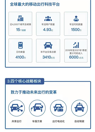 招股书显示,截至2021年3月,滴滴在包括中国在内的15个国家约4000多个城镇开展业务,提供网约车、出租车、顺风车、共享单车、共享电单车、代驾、车服、货运、金融和自动驾驶等服务。