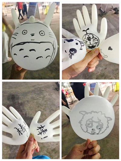 护士小姐姐把橡胶手套吹成气球,逗孩子们笑。