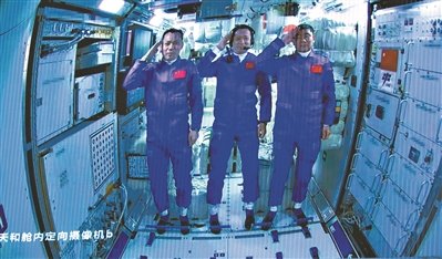 6月17日,在北京航天飞行控制中心拍摄的进驻天和核心舱的航天员向全国人民敬礼致意的画面。 新华社发