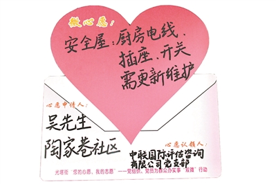 信封翻开,心形升起,爱心里写下“微心愿”,信封上注明“心愿申请人”,右下角落款“心愿认领人”——这张由越秀区光塔街党工委制作的“双微”行动项目卡,践行着“您的心愿 我的志愿”的庄严承诺。