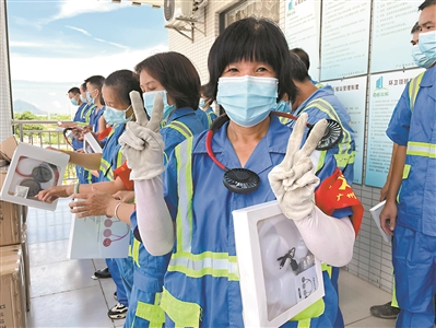 广重集团党委圆梦石壁街环卫工人“微心愿”,向他们赠送随身风扇。广州日报全媒体记者骆昌威 通讯员石壁宣 摄