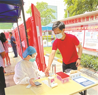 在肇庆,党员文祥发现前来做核酸检测的人员较多,人手急缺,立即报名成为志愿者,在现场对社区的居民们进行耐心的疏导和沟通。