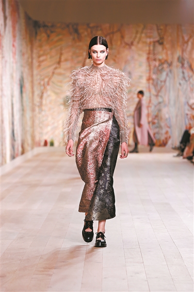 又比如FENDI,秀场被打造成连通现代与往昔的罗马,仿佛要将整个高级定制系列“定格”在罗马一般,通过现代演绎,设计师赋予了古董衣服一场“新生”。本季将原本的织物等换成真丝提花再现,将丝绸衣物与饰以螺旋纹的刺绣交错重叠,营造出交错视觉效果和朦胧的时间感。业内评论员认为,这是FENDI“探视罗马过往,展望罗马未来”的一种表现,设计既吸取了罗马历史中的灵感,更融合了多元化的浪漫构想。
