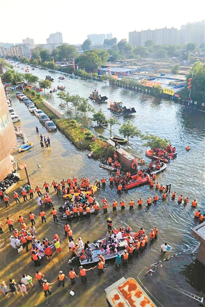 26日下午1时许,记者来到卫辉市建设东路附近积水点。这里聚集了大量应急车辆和搜救船只。现场紧张忙碌,目前被淹区域还有不少群众需要转移。