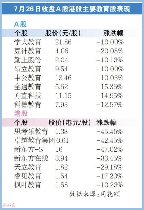 港股方面,教育股全线大跌,截至7月26日收盘,思考乐教育跌超45%,卓越教育集团跌超42%,新东方-S继上周跌40.61%后,再跌47.02%,新东方在线跌33.45%。天立教育跌幅近30%、睿见教育、枫叶教育等港股教育股均跌超10%。