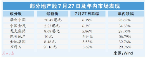 记者梳理Wind数据发现,今年以来A股、港股地产股表现低迷。截至7月27日收盘,中国恒大、融创中国、中国金茂、龙光集团等多个龙头港股年内累计跌幅超过20%。而A股地产板块年内房地产指数累计跌幅超10%。截至7月27日,保利地产年内跌幅36.79%;金地集团年内跌幅32.76%;万科A年内跌幅29.76%。