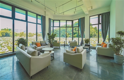 “荷·美空间”内大片的落地窗提供了绝佳的观景视野,在这里即可远眺鹭岛上的白鹭翩翩,也可近观2万余平方米的荷塘景观,及至夏日,满眼的荷花、扑面的荷香,是喧嚣闹市中不可多得的一处静谧所在。