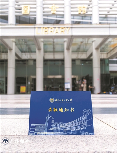 今年广东外语外贸大学的录取通知书外页采用“广外蓝”为主体色,上印烫金工艺的校徽校训和黄色简笔线条的南北校区图书馆,彰显庄重典雅。