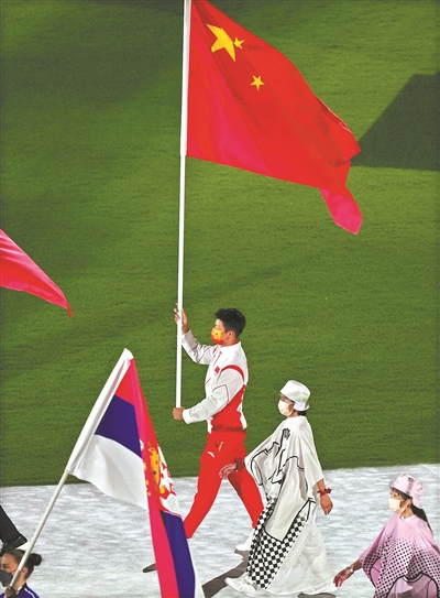 广州日报讯 (全媒体记者杨敏)2020东京奥运会闭幕式上,来自广东的“亚洲飞人”苏炳添担任中国体育代表团旗手(上图,新华社发)。“能够成为闭幕式旗手,我感到无比光荣和自豪。”苏炳添表示,担任旗手不仅代表个人,更代表着中国体育代表团的形象,向世界展示中国体育健儿在追求更高、更快、更强、更团结的奥林匹克精神。