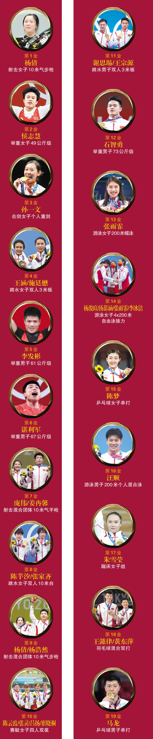 老将新人均有优异表现。巩立姣、吕小军、马龙、庞伟、施廷懋、王涵等老运动员勇夺金牌,苏炳添、张亮取得个人最好成绩;杨倩、张常鸿、全红婵、陈芋汐、张家齐、管晨辰、杨浚瑄等多名“00后”运动员发挥出色。