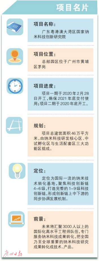 其中,广纳院总部园区位于广州市黄埔区茅岗,项目总建筑面积46万平方米,由纳米科技研发核心区、中试孵化区与生活配套区三大功能区组成。园区将主力打通创新链4-6级,推动全球纳米科技创新成果在大湾区落地孵化,构建大湾区高精尖产业结构,形成以创新性、颠覆性技术为核心的产业集群和生态圈,打造具有全球影响力的纳米技术产业新高地。