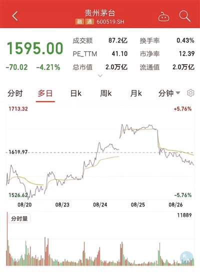 实际上,在二级市场上,8月20日贵州茅台大幅低开约4个百分点,跌破1600元/股关口,盘中最低价为1550.01元/股,创下自2020年7月6日来新低。