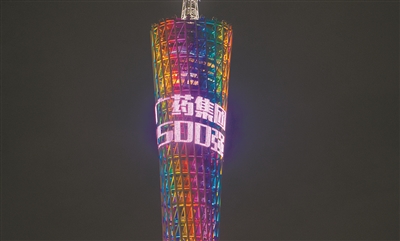 广药集团迈入世界500强的消息登上广州塔。 广州日报全媒体记者李波 摄