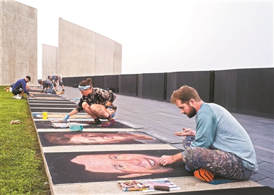 9月9日,在宾夕法尼亚州尚克斯维尔的93号航班国家纪念园,艺术家绘制遇难者画像。新华社发