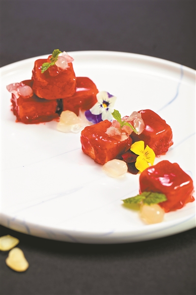 清汤雪莲子是用经过6个小时熬制而成的清鸡汤融合雪莲子,鸡汤的鲜味被雪莲子吸收,搭配上香甜的雪梨,清汤的鲜味与甜味在舌尖上绽放;龙皇汤雪莲子石榴球,皮嫩鲜滑石榴球,搭配鲜大虾熬制的龙皇汤,汤水锁住了虾的鲜味。雪莲子口感软糯,品尝更添口感;西汁雪莲子牛仔粒则选用雪花牛仔粒和雪莲子,搭配酸酸的汁酱,外表色泽鲜艳,味道酸甜可口。