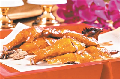 花园酒店桃园馆的行政主厨温师傅呈现一道“花园玻璃脆皮鸡”,以研磨调配的秘制五香粉对鸡进行腌制,待鸡肉充分吸收香味后上钩风干,再淋上秘制酱汁放入瓦窑内吊烧。在此过程中,厨师精准掌握火候,将鸡在瓦窑三进三出直至其表皮呈金黄,表皮晶莹亮泽,犹如玻璃质感,汁水饱满,肉嫩至极;而东方宾馆的“粤菜特金奖”招牌名菜——金丝香芒捞手撕鸡更是师傅别出心裁研制的经典之作。