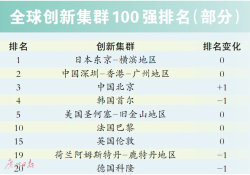 排名前五的分别是:日本东京-横滨地区、中国深圳-香港-广州地区、中国北京、韩国首尔、美国圣何塞-旧金山地区。与去年相比,深圳-香港-广州(第2位)排名不变,北京(第3位)、上海(第8位)、南京(第18位)、杭州(第21位)等排名均有上升,且上升幅度明显。