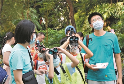 广州动物园“动物课堂”亲子家庭在观鸟。
