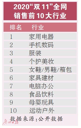 分品类来看,2020年“双11”全网销售额排名第一的是家用电器行业。而2019年“双11”全网销售额排名第一的个人护理行业降至第四位。