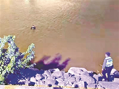 很快,副中队长李伟扬带领警辅也赶到了现场,他走到岸边尝试安抚男子情绪,与其聊天引导其走回岸边。然而男子一言不发,对民警的劝说不为所动。当李伟扬尝试进一步靠近男子时,男子竟往深水区走去。无论民警怎么劝解,男子仍然一语不发,缓缓往河中央走去。
