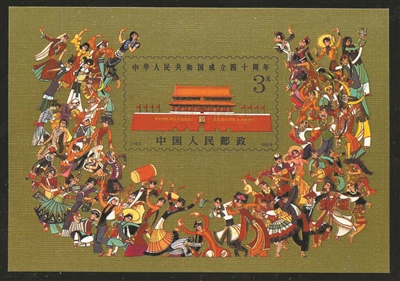 作为第一套展现56个民族的邮票,《中华人民共和国成立四十周年》纪念邮票中的这枚小型张的发行无疑是令人激动的。但由于各民族人物都集中在一起设计,除了民族专家,一般集邮者很难一一识别出每个人物是哪个民族的。