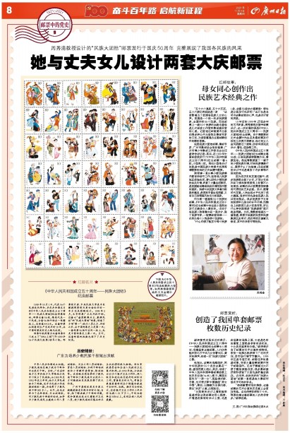 说起民族大团结邮票,集邮专家、广州市集邮协会常务理事、广州市青少年集邮工作委员会主任谢诤告诉记者:其实,在1989年中国邮政就发行了《中华人民共和国成立四十周年》纪念邮票一套4枚,小型张1枚。担任小型张设计的就是中国民族大学美术系周秀清教授和她的丈夫金捷中教授。