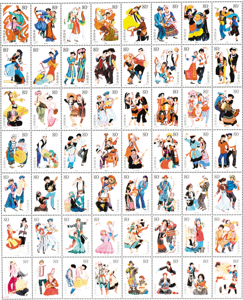 1999年10月1日,代表56个民族欢乐祥和、共庆共和国生日的《中华人民共和国成立五十周年——民族大团结》纪念邮票面世,邮票全套56枚,每枚代表一个民族,全套56枚印制在一张整版上,总面值44.8元。这套邮票从创意到生产完成历时10年,在中国邮票发行史上绝无仅有。