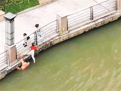 因为河涌不是很宽,他很快便游到了遇溺的小女孩身边。由于岸边离水面比较高,对面只有两个小朋友,没有大人在,他只能用尽全身的力量把遇溺的小女孩托举到岸边的护栏上,其间还不小心呛了一口水。“还好小女孩子吐了些水后还清醒,我就叫她抓住(栏杆),等叔叔上岸再抱她起来。”