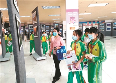 参观“永远跟党走”2021年南村镇美丽乡村专题摄影展的小学生