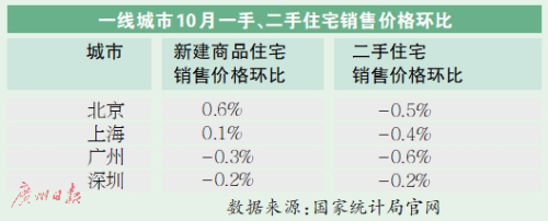 国家统计局发布数据显示,10月份,一线城市新建商品住宅销售价格环比持平。其中,北京和上海环比分别上涨0.6%和0.1%,广州和深圳分别下降0.3%和0.2%。一线城市二手住宅销售价格环比下降0.4%,与上月相同。其中,北京、上海、广州和深圳环比分别下降0.5%、0.4%、0.6%和0.2%。由此可以看出,10月份,广州在一线城市中,无论一二手住宅,均是下降程度最大的,其中二手房跌幅较大。