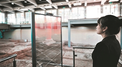 让这一目标部分实现的一个关键技术是MR。技术人员在南汉国二号宫殿的位置,设置了一组由OLED透明屏、旋转平台和眼球追踪系统三者结合的系统,实现复原建筑在遗址空间上的准确定位。记者在现场体验了一下,发现随着自己视线高度、角度的变化,显示在透明屏上的宫殿图像也在不断变换角度。项目技术方、上海美岚展览工程有限公司负责人陆旭介绍,虚拟图像和透明屏背后的遗址是实景匹配的,屏幕上看到的柱子,就是遗址里那些磉墩,“这种技术就是让大家明白究竟遗址的各个地方,原来是些什么东西,是什么样子”,他说。这也是全国首次将MR、OLED透明屏及眼球追踪技术整合运用到大遗址数字化展示中。