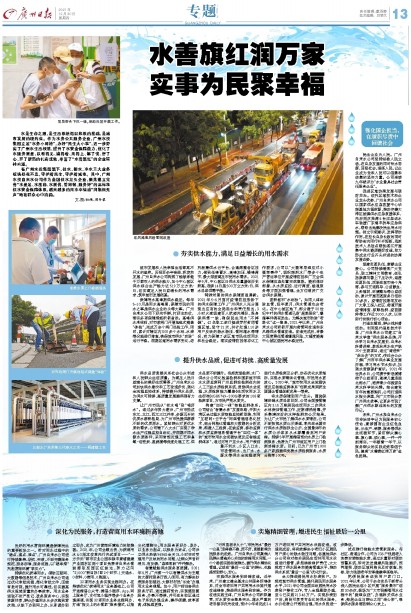 水是生命之源,是生态系统得以维系的基础,是城市发展的硬约束。作为水务公共服务企业,广州水投集团立足“水务小网格”,办好“民生大小事”,进一步夯实了广州水生态根基、提升了水安全保障能力,优化了水服务质量,以看得见、摸得着、用得上、解了忧、舒了心、开了新局的扎实成效,丰富了“水善旗红”的企业精神内涵。