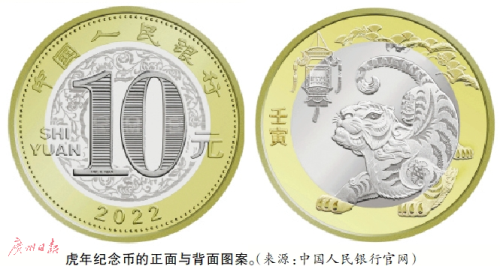 记者了解到,虎年纪念币自1月7日开启预约,广州市民在线上和线下争饮“头啖汤”。人民银行官网显示,2022年贺岁双色铜合金纪念币面额为10元,材质为双色铜合金,其正面图案为“中国人民银行”“10元”字样,汉语拼音字母“SHIYUAN”及年号“2022”,底纹衬以团花图案。背面主景图案为中国传统剪纸艺术与装饰年画元素相结合的老虎形象,衬景图案为花灯和松枝、松果,币面左侧刊“壬寅”字样。