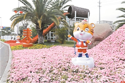 南沙区立体绿化中摆放老虎雕塑,喜迎虎年。